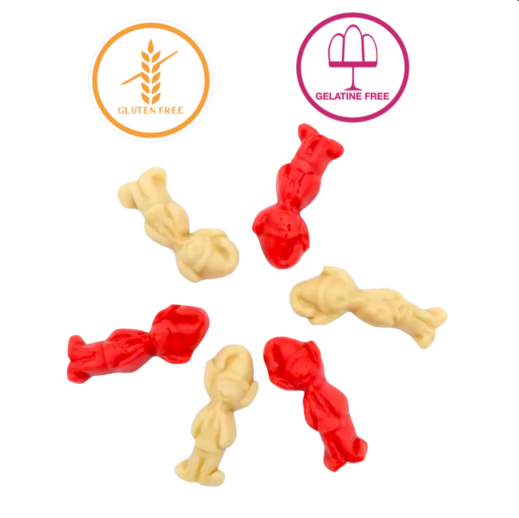 Christmas Elves– Caramel and Vanilla flavoured gummies - Glucose syrup, Sugar, Corn starch, Pork and Beef Gelatine, Acid (lactic acid), Flavourings, Gelling agent (pectins), Vegetable oils (palm), Glazing agent (beeswax, carnauba wax), Colour (E129).