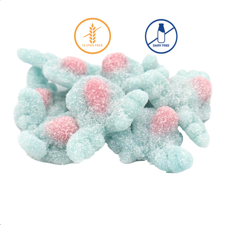Snowflakes Snowflake shaped raspberry and vanilla sugary jelly sweets – Glucose Syrup, Sugar, Corn Starch, Gelatine (Pork & Beef), Acids (Citric Acid, Lactic Acid), Gelling Agent (Pectins), Flavourings, Colours (E133).