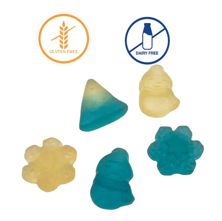 Snowflakes Snowflake shaped raspberry and vanilla sugary jelly sweets – Glucose Syrup, Sugar, Corn Starch, Gelatine (Pork & Beef), Acids (Citric Acid, Lactic Acid), Gelling Agent (Pectins), Flavourings, Colours (E133).