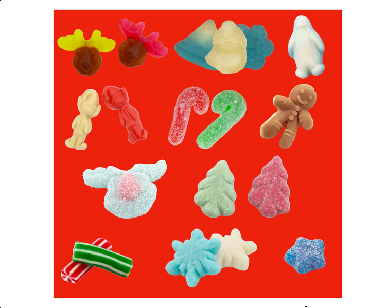 Glucose syrup, Sugar, fructose syrup, invert sugar syrup, Wheat Starch, Corn Starch, Water, Modified Maize Starch, Modified Potato Starch, vegetable fat (palm), humectant (glycerol), Gelatine (Beef, Pork gelatine), Humectant: glycerol; Acids: citric acid, malic acid; Caramel Syrup, Flavourings Plant vegetable and fruit concentrates (Apple, Black Carrot, safflower, spirulina, radish, blackcurrant, carrot), Vegetable Oil (Coconut, Palm,Kernel), Gelling Agents pectins Glazing agent: Carnauba Wax beeswax; Flavourings, Acidity Regulator (potassium citrates, Sodium Malates), Sodium Hydrogen Carbonate (E331) emulsifier (E471), salt, Colour: (plain caramel, titanium dioxide, Curcumin) (E100 E120 E129 E133).