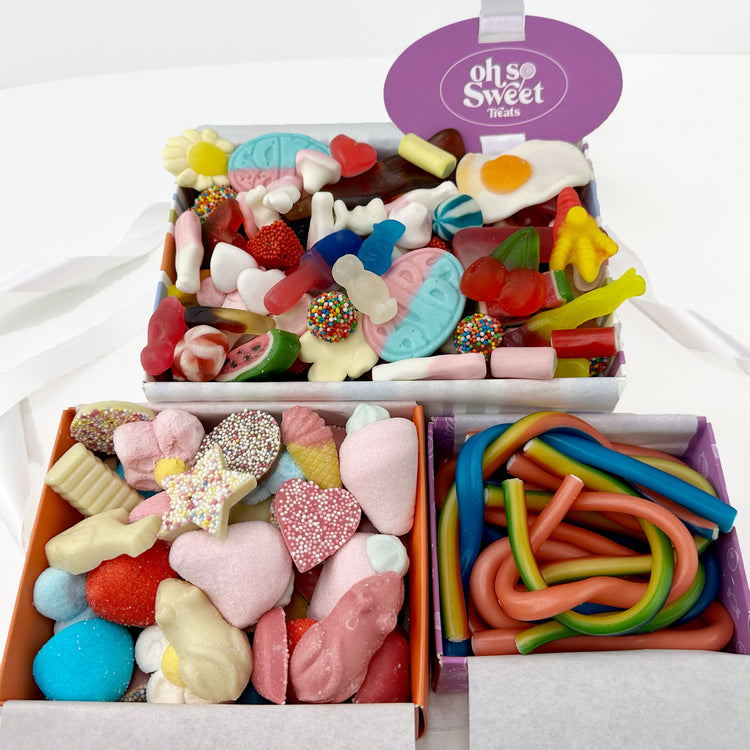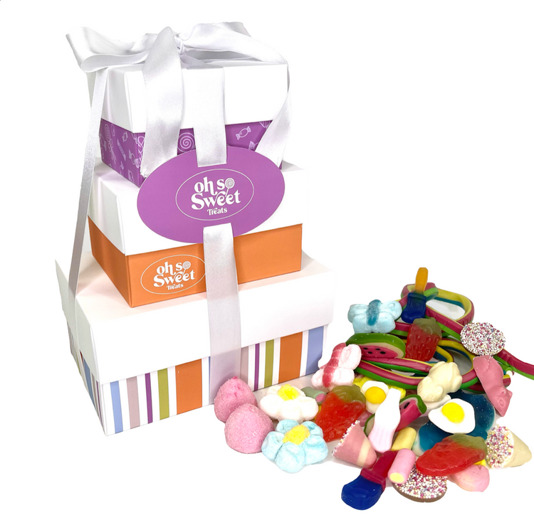 Our perfect gift the Awesome tower of sweets you will find a different treat in each box. Each box is packed full of treats to satisfy everyone.